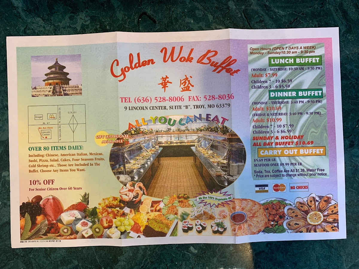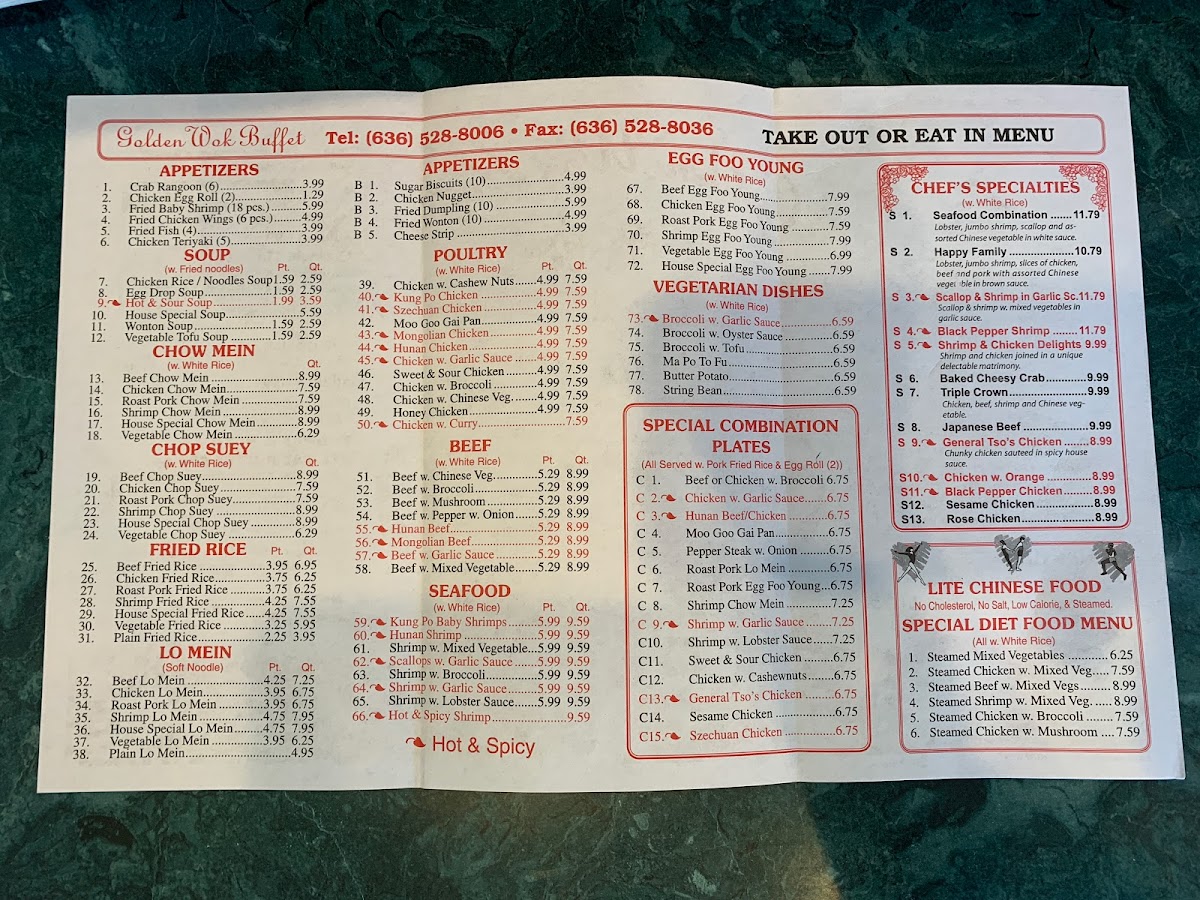 The menu at Golden Wok Buffet offers a variety of Chinese cuisine served in both buffet and à la carte formats. Guests can choose from a selection of fried rice dishes, chef’s specialties, egg foo young, hot entrees, and appetizers, allowing for a diverse dining experience suited to lunch or dinner.
